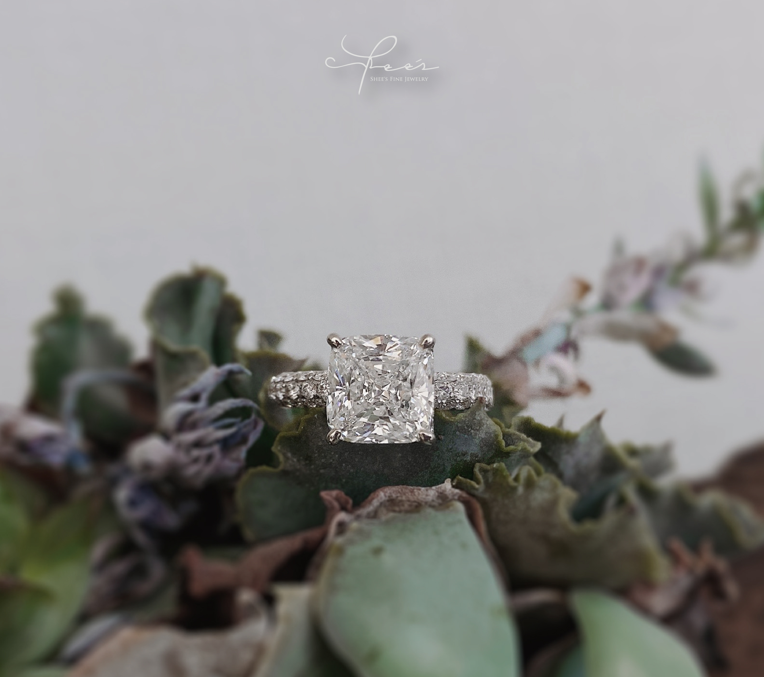 主鑽三克拉雷迪恩切割鑽戒,以四爪將主鑽托高,側腰及戒台鑲上滿滿的配鑽,華麗感升級,璀璨度更也加耀眼。