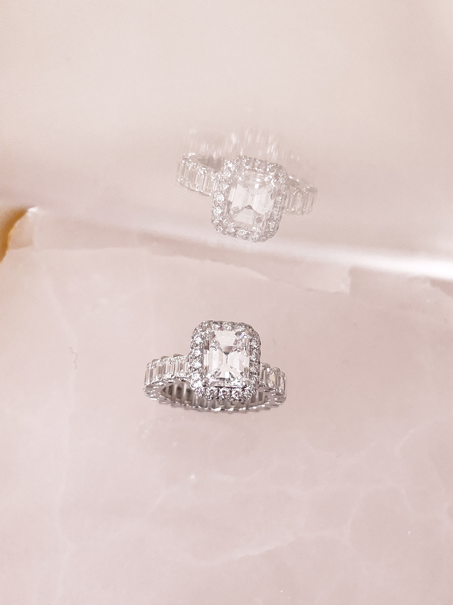 主鑽2克拉Halo款式祖母綠切割鑽戒,戒台使用每顆20分 Emerald Cut Eternity Band,如天使光環的設計有細緻地放大主鑽的效果,我們特別著重在光環與主鑽之間沒有過大又老氣的縫隙,並使用兩層小鑽以圓潤細膩的設計去呈現婚戒。